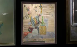 Wśród zaprezentowanych na Biennale obrazów, znalazła się również Martwa natura z butelką, namalowana w 1956, którą oferujemy na naszej aukcji. Obraz ten jest malarskim dowodem na to, jak wielkie bogactwo rozwiązań kolorystycznych, fakturalnych i kompozycyjnych znajdował artysta, podejmując wiele razy te same tematy i motywy. Martwa natura z butelką kompozycyjnie rozwiązana jest poprzez łagodnie diagonalne uszeregowanie przedmiotów na pierwszym planie, z dominującą plamą zieleni butelki, która tworzy kolorystyczne napięcie wobec plam czerwieni w lewym dolnym narożniku obrazu. Kompozycja dopełniona jest impresyjnie potraktowanymi kwiatami (z pięknym poprowadzeniem linii gałązek i zróżnicowaniem kolorystycznym liści) oraz rytmem lekko położonych poziomych muśnięć, spinającym całą płaszczyznę tła.
