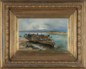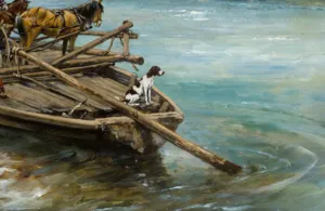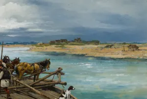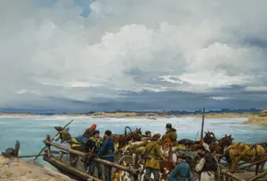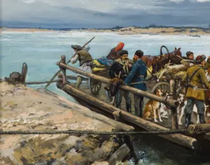 Na aukcji w 2022 r. prezentowaliśmy niewielką akwarelę, która stanowiła zapewne szkic do późniejszych kompozycji olejnych. Artysta z niemal etnograficzną sumiennością oddał przegląd warstw społecznych, które w ten pochmurny dzień przeprawiają się promem przez Dniestr. Widzimy włościański zaprzęg, chłopów przy wozie z sianem oraz myśliwych z psami rozproszonymi po pokładzie.