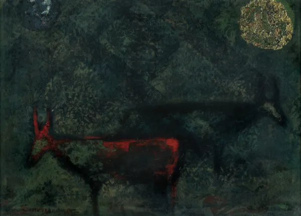 sygn. l.d.: MUSIAŁOWICZ, sygn. oł. na odwr. śr.: Z CYKLU | „KRAJOBRAZ ANIMALISTYCZNY“ | 70 x 50 | 1977 | MUSIAŁOWICZ