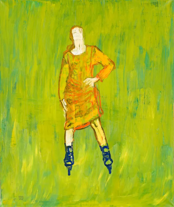 sygn. na odwr. na płótnie l.g.: JACEK ŁYDŻBA | DZIEWCZYNA NA ROLKACH” | 1999, poniżej pieczątka zezwalająca na wywóz za granicę