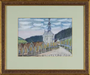 Na odwrocie centralnie dwie pieczęcie: 1. okrągła z przedstawieniem Nikifora Biskupa i napisem w otoku: PAMIĄTKA Z KRYNICY . NIKIFOR . MALARZ; pod nią prostokątna: NIKIFOR ARTYSTA KRYNICA WIEŚ; poniżej autorski napis: 500 ZŁ; nad okrągłą pieczęcią (ołówek): 17a [w kółku]; przy lewej krawędzi (ołówek): 16,8 x 23,5 | 25384C, obok (druk) logo Wydawnictwa Artystyczno-Graficznego RSW „Prasa-Książka-Ruch“, przy dolnej krawędzi (ołówek): 25 03 29 8; 1600,