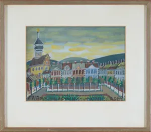 Na odwrocie centralnie trzy okrągłe pieczęcie: NIKIFOR MATEJKO | ARTYSTA MALARZ KRYNICA WIEŚ; pośrodku autorski napis: 100 0 ZŁ; poniżej pieczęć Prezydium Rady Narodowej m. Łodzi, Wydział Kultury z zezwoleniem wywozu za granicę oraz numerem L. dz. Kl. III-662/ 75/68 p. 2, poniżej nieczytelny podpis.
