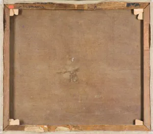 – na p. listwie krosien częściowo zdarta nalepka: Autor Stefan Filipkiewicz | Tytuł dzieła Strumień w zimie | Rodzaj olej | Cena Rb. 380 rb. | podpis Stefan Filipkiewicz, na l. marginesie nalepki napis: Zaniedbujący umieszczenia | niniejszej kartki na dziele | zrzeka się tem samem pra- | wa do reklamacji za ewen- | tualne pomyłki; na p. marginesie napis: Kartkę niniejszą należy | przykleić na odwrotnej | stronie dzieła.