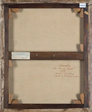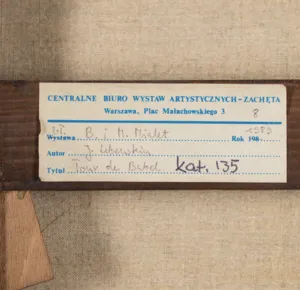 Na śr. listwie krosna nalepka Centralnego Biura Wystaw Artystycznych „Zachęta“ [druk/atrament]: 8 | wł. B. i M. Mialet Rok 1989 | Autor Jan Lebenstein | Tytuł Tour de Babel kat. 135, na g. listwie nalepka z numerem: 13.