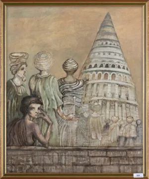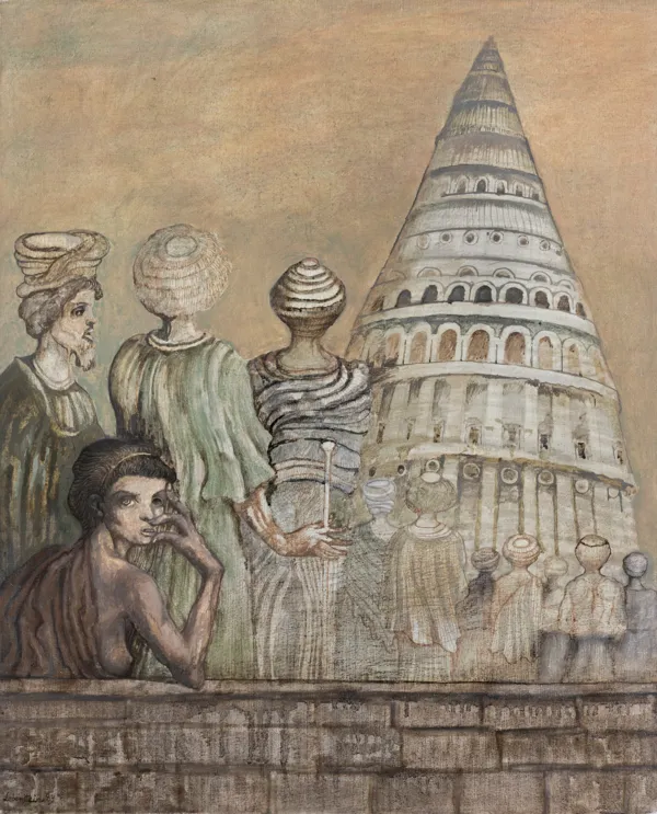 sygn. na odwr. na płótnie p.: Lebenstein | „La Tour de Babel“ | 1989 | format 61 x 50 cm | huile + technique mixte