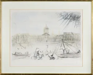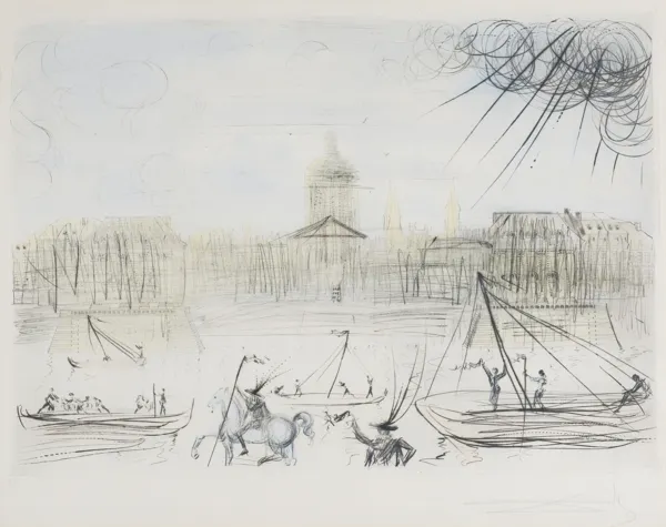 Widok od strony Sekwany na gmach Académie des Beaux-Arts w Paryżu. Grafika według wcześniejszego rysunku, wykonana z okazji wyboru artysty na członka Akademii w 1979 r.