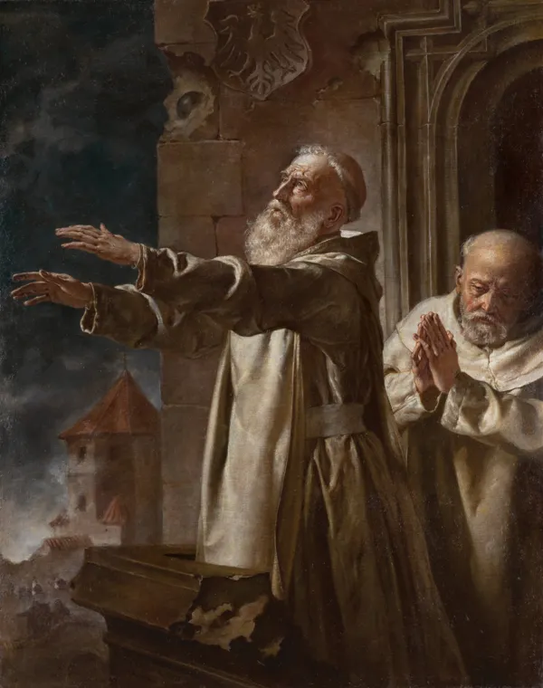 Podobne ujęcie, modlącego się na wałach klasztoru paulina, przyjmie 13 lat później Jan Matejko w znanym dziś jedynie z drzeworytu dziele Kordecki na murach Częstochowy, błagający o pomoc Bożą.