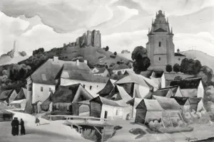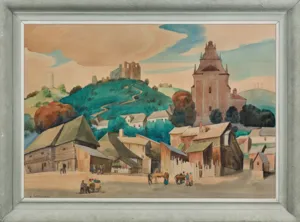 Oferowana praca wpisuje się w serię takich właśnie, fantastycznych widoków utworzonych z elementów architektury Kazimierza, przedstawionych jednak niczym scenografia teatralna – w jednym planie, za „sceną“, na której artysta umieszcza postaci i scenki z życia miasteczka. Zbliżone ujęcie widzimy na akwarelach Kazimierz nad Wisłą (z jeźdźcami), czy Kazimierz nad Wisłą, 1928, znanych dziś tylko z fotografii.