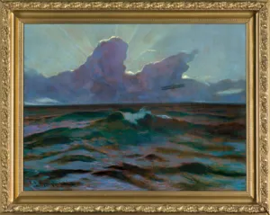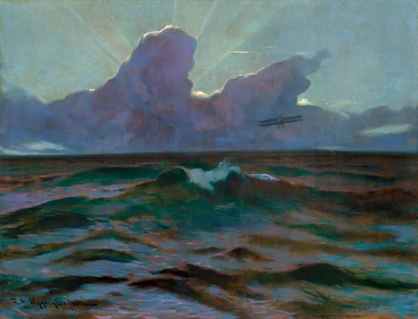 Dzieło Wygrzywalskiego, powstałe w 1928 roku, uderza nie tylko rozmachem kompozycji, ale i niezwykle nowoczesnym jak na swoje czasy tematem. Na tle monumentalnych, ciężkich chmur, przeszywanych promieniami słońca, widzimy samotny samolot przelatujący nad oceanem – motyw, który można odczytywać w kontekście przełomowych wydarzeń z historii lotnictwa. W 1928 roku cały świat obiegła wiadomość o pierwszym kobiecym przelocie nad Atlantykiem: Amerykanka...