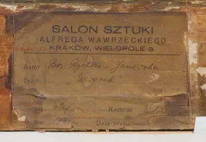 Na górnej listwie ramy nalepka Salonu Sztuki Alfreda Wawrzeckiego w Krakowie.