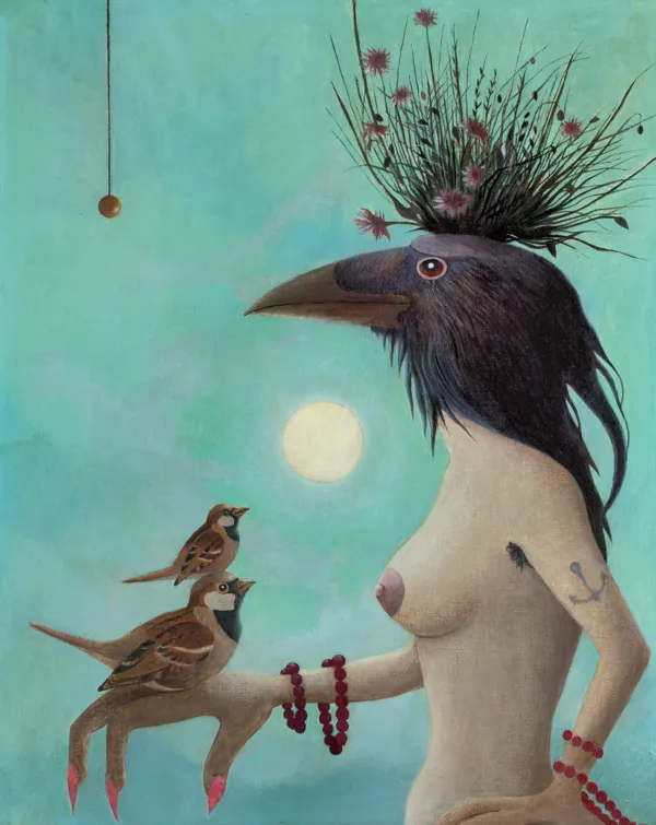 Kazimierz Mikulski, w krakowskich kręgach artystycznych nazywany „Balzakiem“, przez dziesięciolecia pozostawał wierny raz wypracowanej i jasno określonej poetyce twórczości. Była to baśniowa, na pierwszy rzut oka rozpoznawalna formuła malarska, która wykształciła się pod wpływem wieloletniej współpracy z Teatrem „Groteska“ w Krakowie. Z niezmiennego repertuaru motywów – pięknych dziewcząt-lalek, kotów, księżyca w pełni, ptaków, owadów, czy drzew – artysta konstruował uporządkowany, wyimaginowany świat przypominający teatralną inscenizację. Malarstwo to jest jednocześnie przepełnione atmosferą cudowności jak i perfekcyjne pod kątem odwzorowania postaci i przedmiotów. Obrazy są zorganizowane na sposób niemal geometryczny z precyzyjnie wykreślonych form, starannie wkomponowanych w umowną przestrzeń płótna. Klarowność kolorów i kształtów pełni nie tylko rolę estetyzującą, ale zdaje się też potęgować liryczny nastrój i tajemnicę, jaką kryje surrealna sceneria. Zespół tych cech można odnaleźć w prezentowanej w katalogu Bogini nocy i ptaków z 1978 roku. Na tle turkusowego, rozrzedzonego plamami bladego błękitu nieba stoi – zastygła niczym w filmowym kadrze – ujęta z profilu, kobieca postać. To bogini o głowie kruka – symbolu ciemności i nocy, „pani“ wszelkich ptasich stworzeń. Strojna w bransoletki i pomalowane paznokcie-szpony, eksponuje idealną, krągłą pierś, będąc uosobieniem odrealnionego, wysublimowanego erotyzmu. Podziwiając urodę bóstwa i próbując odczytać znaczenie tego intrygującego portretu, wkraczamy do zaczarowanej Balzakowej krainy. Tak scharakteryzowała go Marta Stebnicka: Tam jest tyle poezji, magii, teatru – to działa jak takie tabletki zrzucane z nieba, rozweselające i uspokajające. Każdy artysta powinien złagodzić coś z nieszczęść i rozpaczy tego świata. I on należy do takich, którzy łagodzą, przenoszą nas w trochę inną rzeczywistość. To jest wspaniałe – jak dobrze, że są tacy artyści (K. Czerni, Rezerwat sztuki, Tropami artystów polskich XX wieku, Kraków 2000, s. 77). W odróżnieniu od wcześniejszych podobnych przedstawień w „naszym“ obrazie można dostrzec pewne drobne zmiany w ikonografii uniwersum Mikulskiego typowe dla lat 70. Należą do nich: karykaturalnie rozrośnięta dłoń, niesforna kępa kwietnej trawy, czy wskazujący na nocną porę księżyc. Zaburzając nieskalaną harmonię „słonecznych“ scen z udziałem kobiet-ideałów i filuternych zwierzątek, wprowadzają nową wartość: niepozbawiony humoru ton ironii i niepokoju. Tym samym kusząca atrakcyjną warstwą wizualną Bogini nocy i ptaków może się też stać przyczynkiem do pogłębionych interpretacji.