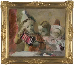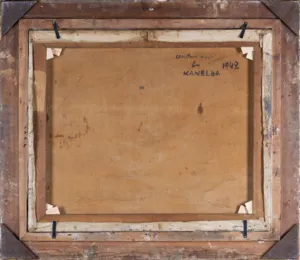 Na odwrocie p.g. (czarną farbą): „Christmas music“ | by | KANELBA | 1942; na lewej listwie krosna nalepka (długopisem): „Christmas music“ | by | KANELBA | 52 Park Mansions | London S.W.; ponadto na wszystkich listwach krosna pieczęć z napisem: MADE IN ENGLAND.