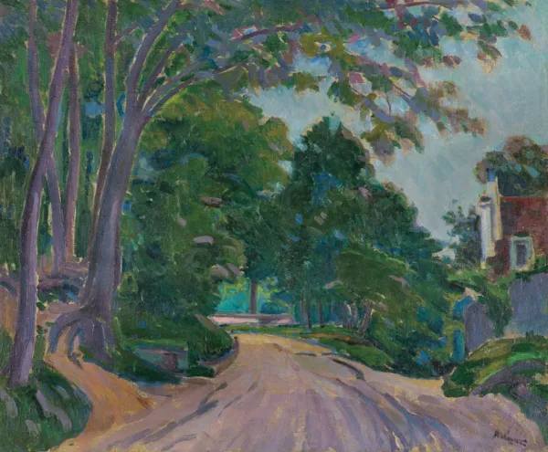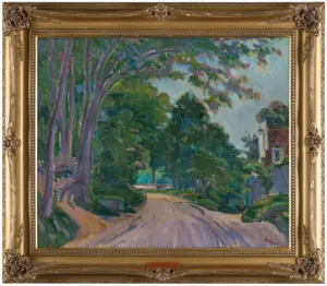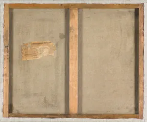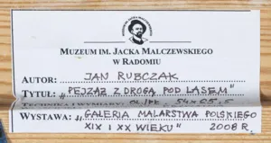 Na górnej listwie ramy naklejka (druk, czarny flamaster): MUZEUM IM. JACKA MALCZEWSKIEGO W RADOMIU | AUTOR: JAN RUBCZAK | TYTUŁ: „PEJZAŻ Z DROGĄ POD LASEM“ | TECHNIKA I WYMIARY: OL.PŁ., 54×65,5 | WYSTAWA: „GALERIA MALARSTWA POLSKIEGO XIX I XX WIEKU“ 2008 R.