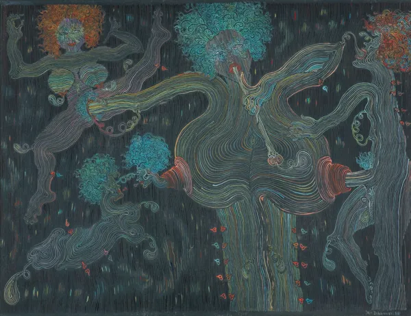 na odwr. sygn. p.g.: Jan Dobkowski | „KONCERT BIOLOGICZNY“ 1985 | olej + akryl | 60 cm x 80 cm