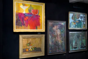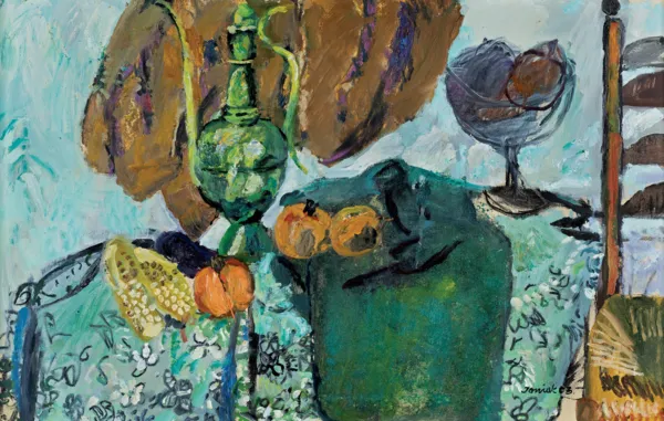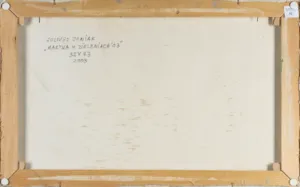sygn. na odwr. na płótnie l.g.: JULIUSZ JONIAK | „MARTWA W ZIELENIACH ’03“ | 52 x 83 | 2003