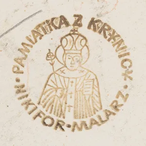Na odwrocie centralnie okrągła pieczęć z przedstawieniem Nikifora Biskupa i napisem w otoku: PAMIĄTKA Z KRYNICY * NIKIFOR MALARZ *; poniżej (ołówkiem): 200 ZŁ; ponadto u góry notatki ramiarskie