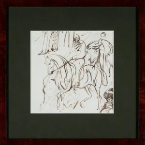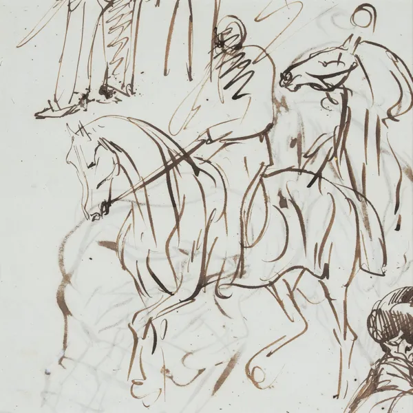 Rysunek przedstawia szkice jeźdźców i mężczyzn. W świetle passe-partout widoczna jest kompozycja z dwoma jeźdźcami. Na odwrocie postać jeźdźca na koniu. Część kartki zawinięta.
