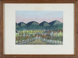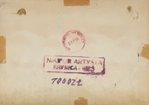 Na odwrocie dwie pieczęcie: - okrągła z napisem: MISTRZ Z KRYNICY | NIKIFOR; - NIKIFOR ARTYSTA | KRYNICA – WIEŚ; poniżej (farbą): 1000 ZŁ