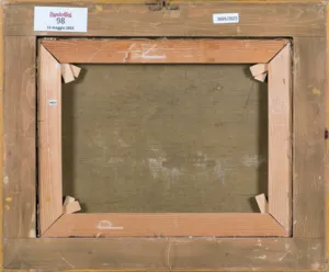 Na odwrocie, na ramie, nalepki włoskiego domu aukcyjnego.