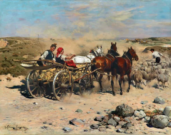Prezentowany obraz przedstawia scenkę rodzajową z wiejskiego życia. Para młodych wieśniaków, jadąca wypełnioną sianem bryczką zaprzężoną w trzy konie, natrafia na stado owiec blokujące im przejazd. Przed nimi pasterz stara się przegonić trzodę, jednak nie wygląda ona na przestraszoną i stoi spokojnie na drodze. Spod końskich kopyt i wozu unosi się kurz poderwany z kamienistej drogi. Pył tworzy lekką, niemal mglistą zasłonę, która zmiękcza kontury dalszego planu.