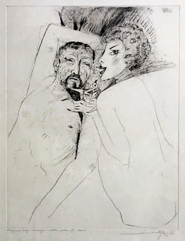 sygn. z płyty l.g.: RÓZGA [podkreśl.) | 24-X-86; oł pod ryc. l.: Obcinanie brody - suchoryt - odbitka próbna III - stan III; p.: Leszek Rózga imp. X | 1986