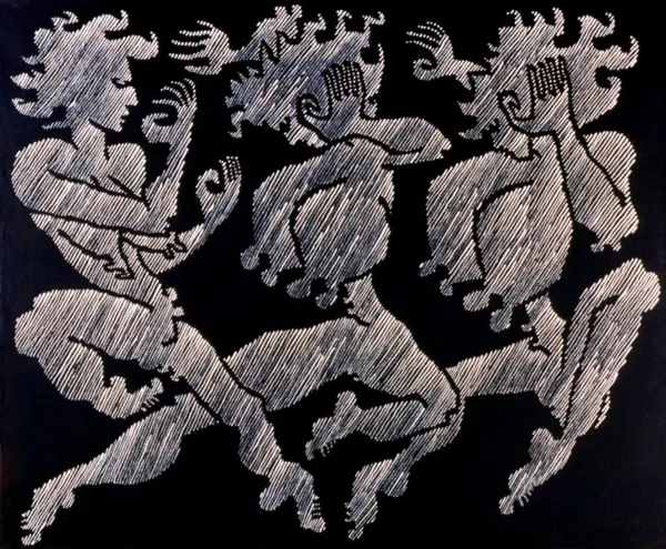Trzy "antyczne" nagie postaci – hieratyczne, choć w tanecznym ruchu – malowane są srebrną farbą na jednolicie czarnym tle, co budzi skojarzenia z greckim malarstwem na wazach
