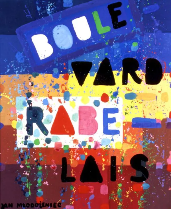 napis na kompozycji od g.: BOULE | VARD | RABE | LAIS, sygnowany l.d.: JAN MŁODOŻENIEC, na odwr. płótna l.: JAN MŁODOŻENIEC . bulwar Rabelais . tempera | czerwiec 1998