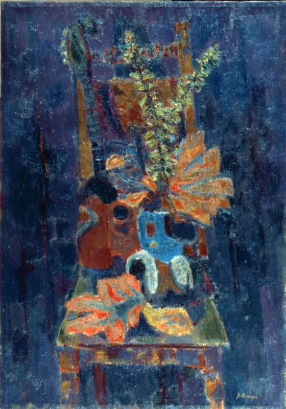 sygnowany p.d.: J. Kraupe, na odwr. śr.: JANINA KRAUPE | "MARTWA NATURA | Z GITARĄ" 1954 | OLEJ