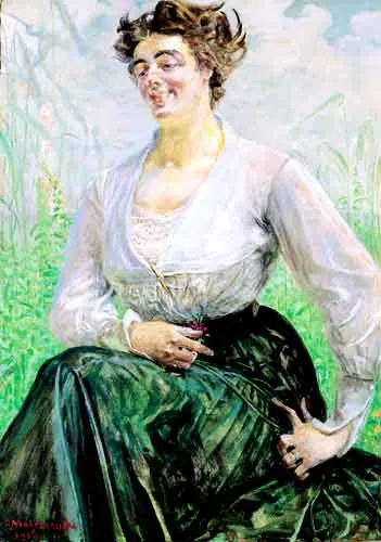 Portretowana pani to prawdopodobnie Michalina Janoszanka (1889-1952) malarka i pisarka, autorka wspomnień o Jacku Malczewskim pt. Wielki tercjarz. Malczewski malował ją, jeszcze jako małą dziewczynkę; w latach późniejszych pozowała mu wielokrotnie do portretów (np. Portret w Muzeum Narodowym w Warszawie) i jako modelka do większych, symbolicznych kompozycji.