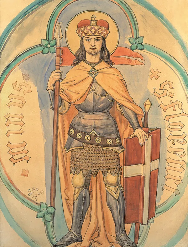 Gorzkowski zgromadził pokaźną kolekcję dzieł Matejki; jej katalog wydany w roku 1896 wymienia 35 obrazów olejnych, 26 akwarel i 182 rysunki. Karton ze Św. Florianem - jedna z kilku prac-projektów do polichromii Kościoła Mariackiego - w katalogu opisany jest następująco: „Wielki oryginalny karton akwarelowy, który służył jako wzór do wykonania polichromii w prezbiterium kościoła Panny Maryi, przedstawia motyw wzięty z pieczęci XIV wieku z Kleparza, jako przedmieścia Krakowa i wyobraża Św. Floryana w pełnej zbroi, z książęcą czapką na głowie; płaszcz żółty, na przodzie zapinany; w prawej ręce trzyma lancę z penonem, a lewą opiera na czerwonej tarczy z białym krzyżem Tło niebieskie, a całość obrazu ujęta w czworoliść. Miara 145 x 111ctmr; wykonany w roku 1889“.