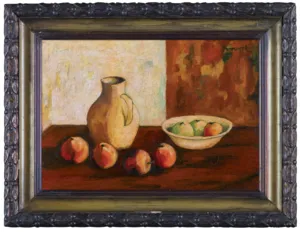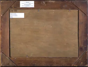 na odwrocie numer inwentaryzacyjny (czarnym markerem): PM 734 (powtórzony również powyżej na ramie); poniżej nalepka z opisem obrazu i nr. inwentaryzacyjnym; na górnej listwie ramy nalepka aukcyjna Agra-Art z 1998 r.