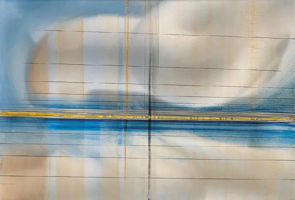 syg. na odwr. śr.g.: BOGUSZ MARIAN | „PRZESTRZEŃ X“ - 1977 | 0.70 x 1.00 - ACRIL + ALUM. | Własność prywatna!, obok numery, flam.: 73, na plastrze lekarskim: 337