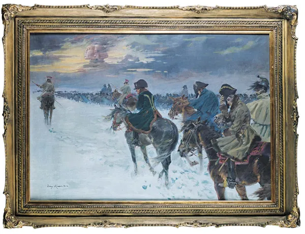 Odwrót Wielkiej Armii spod Moskwy, kiedy to brnącym przez śniegi żołnierzom jawi się w obłokach głowa egipskiego Sfinksa, jest jedną z najpopularniejszych oryginalnych kompozycji Jerzego Kossaka. Artysta malował ten motyw kilkakrotnie, jedna z wersji znajduje się w zbiorach Muzeum Narodowego w Warszawie (porównaj: K. Olszański, Jerzy Kossak, Wrocław 1992).
