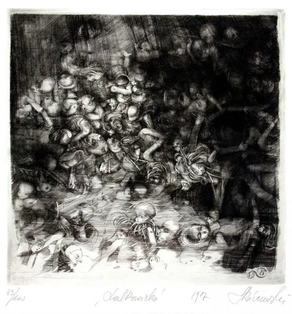 sygn. z płyty p.d.: S 1987 [data wpisana w leżącą literę, cyfra "7" odwrócona], sygn. oł. pod ryc. l.: 43/100, śr.: "Lalkowisko", p.: 1987 Skórczewski