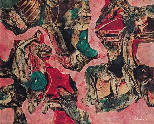 na odwrocie na płótnie napis zielonym flamastrem p.g.: A.LENICA | WARSZAWA | 1957 pośrodku: „W CZERWONYM KRĘGU”