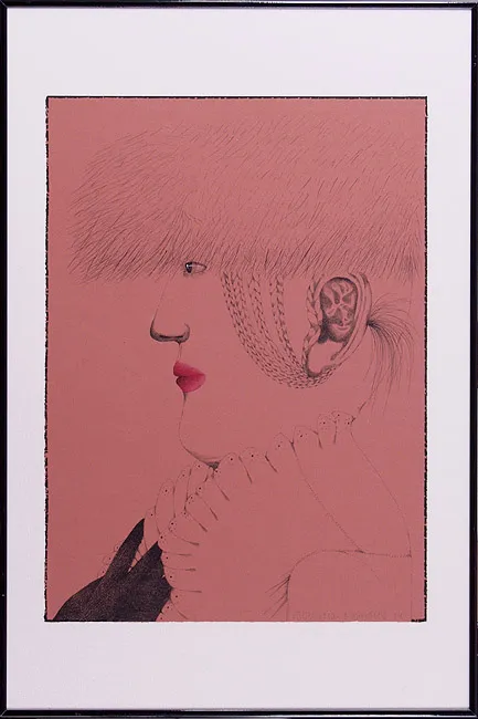 tusze barwne, pióro, papier cielistoróżowy, x cm sygn. oł. p.d.: „Pulcheria” B. Gawdzik 84