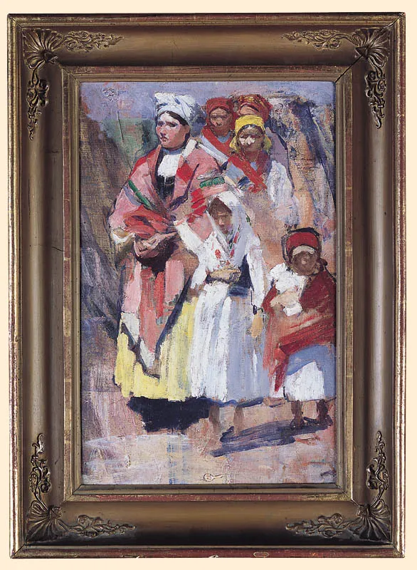 Obraz jest studium malarskim do większej kompozycji znanej jako "Święcenie pól" lub "Procesja w Bronowicach" (ol. pł., 114 x 174 cm; w zbiorach Muzeum Historii Polskiego Ruchu Ludowego; inna wersja w Muzeum Okręgowym w Lesznie). Wśród idących w procesji postaci rozpoznać można, m.in. żonę i córki artysty – odnajdujemy je także w prezentowanym studium. (porównaj np. reprodukcje w: Ks. Nowobilski J.A., "Włodzimierz Te...