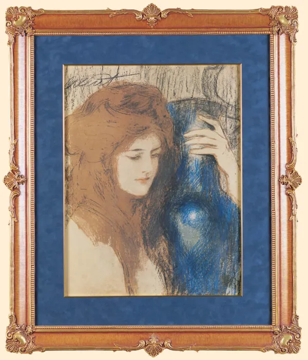 Począwszy od roku 1903 Teodor Axentowicz kilkakrotnie powtarzał ten wyrafinowany kolorystycznie motyw rudowłosej dziewczyny z błękitnym wazonem. Opracowywał go tak w obrazach malowanych pastelemi, jak i w różnych technikach graficznych – algrafii, fluoroforcie i całkiem nowej technice glinorytu, nad którą eksperymentował. Bowiem „zainteresowanie Axentowicza grafiką było ...