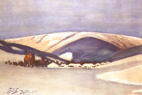 Do położonej na Śląsku Cieszyńskim, blisko Bielska, wsi Bystra Fałat po raz pierwszy przyjechał w roku 1893. Później w roku 1902 przebywał tam na kuracji sanatoryjnej i odtąd przyjeżdżał do Bystrej często. Z czasem zbudował tam willę i pracownię, a po przejściu na emeryturę w roku 1910, zamieszkał w Bystrej na stałe. Często malował wówczas rozległe pejzaże z łagodnymi lesistymi stokami Beskidów. Prezentowany pejzaż zimowy odznacza się, tak typową dla artysty...