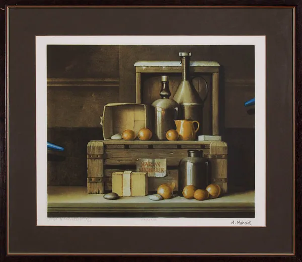 sygnatura z matrycy (element kompozycji) śr. d.: MARIAN | MICHALIK, podpis oł. pod ryc. l.: „CISZA O ZMIERZCHU” (9/25, śr.: SERIGRAFIA, p. facsimile podpisu : M. Michalik