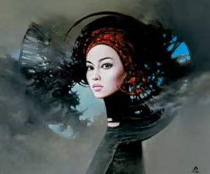 GŁOWA DZIEWCZYNY ZIELONO-CZERWONA
