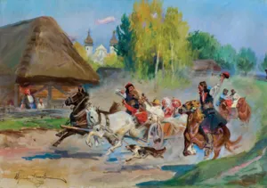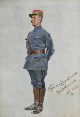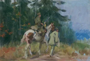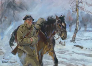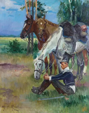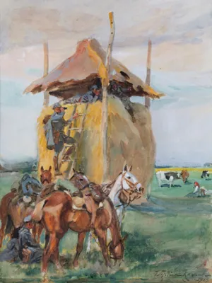 Wojciech Kossak (Paryż 1856 - Kraków 1942 ) – powszechnie znany malarz, postrzegany przede wszystkim jako świetny batalista. Syn i uczeń Juliusza Kossaka kształcił się w krakowskiej Szkole Sztuk Pięknych, w Akademii monachijskiej oraz w Paryżu. W latach 1895-1902 przebywał głównie w Berlinie, pracując dla cesarza Wilhelma II. Wiele podróżował, m.in. do Hiszpanii i Egiptu, gdzie wykonywał szkice do zamierzonych panoram. W późniejszych latach kilkakrotnie wyjeżdżał do Stanów Zjednoczonych wykonując zamówienia portretowe. W 1913 był mianowany profesorem warszawskiej Szkoły Sztuk Pięknych. W latach I wojny światowej pełnił służbę wojskową. Był współautorem panoram: „Racławice” (1893-1894), „Berezyna” (1895-1896), „Bitwa pod piramidami” (1901) oraz szkiców do niezrealizowanej „Somosierry” (1900). Z temperamentem i swobodą tworzył szeroko malowane, dynamiczne sceny batalistyczne, historyczne, rodzajowe oraz liczne portrety. Z upodobaniem malował konie. Jego obrazy, gloryfikujące dawne i współczesne artyście polskie wojsko i bohaterstwo żołnierzy, trafiały do patriotycznych uczuć odbiorców i cieszyły się ogromna popularnością.