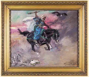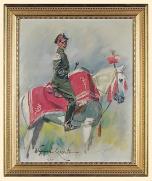Wojciech Kossak (Paryż 1856 - Kraków 1942 ) – powszechnie znany malarz, postrzegany przede wszystkim jako świetny batalista. Syn i uczeń Juliusza Kossaka kształcił się w krakowskiej Szkole Sztuk Pięknych, w Akademii monachijskiej oraz w Paryżu. W latach 1895-1902 przebywał głównie w Berlinie, pracując dla cesarza Wilhelma II. Wiele podróżował, m.in. do Hiszpanii i Egiptu, gdzie wykonywał szkice do zamierzonych panoram. W późniejszych latach kilkakrotnie wyjeżdżał do Stanów Zjednoczonych wykonując zamówienia portretowe. W 1913 był mianowany profesorem warszawskiej Szkoły Sztuk Pięknych. W latach I wojny światowej pełnił służbę wojskową. Był współautorem panoram: „Racławice” (1893-1894), „B...