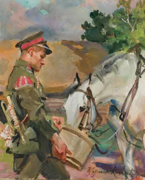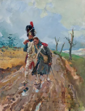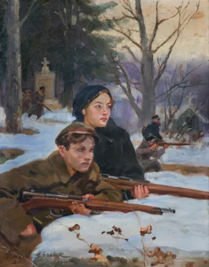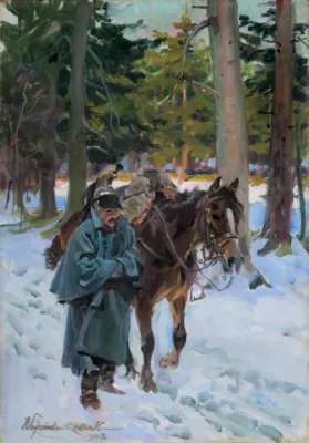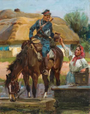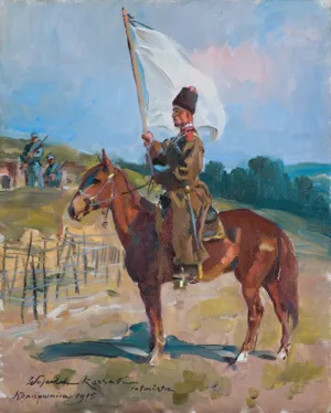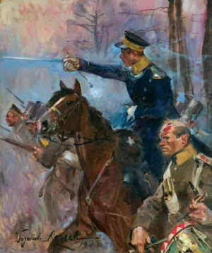 Wojciech Kossak (Paryż 1856 - Kraków 1942 ) – powszechnie znany malarz, postrzegany przede wszystkim jako świetny batalista. Syn i uczeń Juliusza Kossaka kształcił się w krakowskiej Szkole Sztuk Pięknych, w Akademii monachijskiej oraz w Paryżu. W latach 1895-1902 przebywał głównie w Berlinie, pracując dla cesarza Wilhelma II. Wiele podróżował, m.in. do Hiszpanii i Egiptu, gdzie wykonywał szkice do zamierzonych panoram. W późniejszych latach kilkakrotnie wyjeżdżał do Stanów Zjednoczonych wykonując zamówienia portretowe. W 1913 był mianowany profesorem warszawskiej Szkoły Sztuk Pięknych. W latach I wojny światowej pełnił służbę wojskową. Był współautorem panoram: „Racławice” (1893-1894), „B...