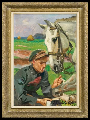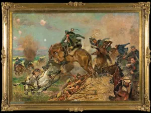 Wojciech Kossak (Paryż 1856 - Kraków 1942 ) – powszechnie znany malarz, postrzegany przede wszystkim jako świetny batalista. Syn i uczeń Juliusza Kossaka kształcił się w krakowskiej Szkole Sztuk Pięknych, w Akademii monachijskiej oraz w Paryżu. W latach 1895-1902 przebywał głównie w Berlinie, pracując dla cesarza Wilhelma II. Wiele podróżował, m.in. do Hiszpanii i Egiptu, gdzie wykonywał szkice do zamierzonych panoram. W późniejszych latach kilkakrotnie wyjeżdżał do Stanów Zjednoczonych wykonując zamówienia portretowe. W 1913 był mianowany profesorem warszawskiej Szkoły Sztuk Pięknych. W latach I wojny światowej pełnił służbę wojskową. Był współautorem panoram: „Racławice” (1893-1894), „B...