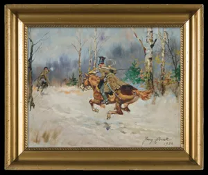 Jerzy Kossak (Kraków 1886 - Kraków 1955)- syn Wojciecha, wnuk Juliusza Kossaków - od wczesnego dzieciństwa malował pod kierunkiem ojca i dziadka. Kontynuator i naśladowca ich sztuki tworzył sceny batalistyczne, historyczne i rodzajowe z wszechobecnym motywem konia. Malował obrazy z powstania listopadowego, wojen napoleońskich oraz wiele scen z wojny 1920 roku. Najbardziej znaną jego kompozycją tego rodzaju był Cud nad Wisłą. Malował też liczne Pogonie i Pościgi ułanów za kozakami, Napady wilków, Polowania i Wesela. Tematyka tych prac sprawia, że stale cieszą się zainteresowaniem zbieraczy i publiczności, zawsze tłumnie odwiedzającej wystawy malarstwa Kossaków.