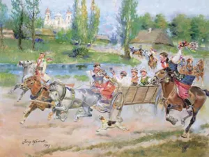 Jerzy Kossak (Kraków 1886 - Kraków 1955)- syn Wojciecha, wnuk Juliusza Kossaków - od wczesnego dzieciństwa malował pod kierunkiem ojca i dziadka. Kontynuator i naśladowca ich sztuki tworzył sceny batalistyczne, historyczne i rodzajowe z wszechobecnym motywem konia. Malował obrazy z powstania listopadowego, wojen napoleońskich oraz wiele scen z wojny 1920 roku. Najbardziej znaną jego kompozycją tego rodzaju był Cud nad Wisłą. Malował też liczne Pogonie i Pościgi ułanów za kozakami, Napady wilków, Polowania i Wesela. Tematyka tych prac sprawia, że stale cieszą się zainteresowaniem zbieraczy i publiczności, zawsze tłumnie odwiedzającej wystawy malarstwa Kossaków.