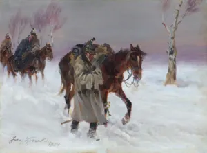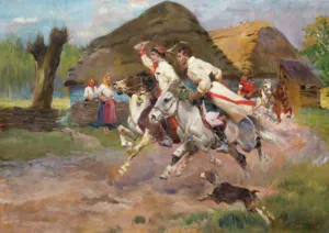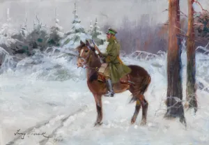 Jerzy Kossak (Kraków 1886 - Kraków 1955)- syn Wojciecha, wnuk Juliusza Kossaków - od wczesnego dzieciństwa malował pod kierunkiem ojca i dziadka. Kontynuator i naśladowca ich sztuki tworzył sceny batalistyczne, historyczne i rodzajowe z wszechobecnym motywem konia. Malował obrazy z powstania listopadowego, wojen napoleońskich oraz wiele scen z wojny 1920 roku. Najbardziej znaną jego kompozycją tego rodzaju był Cud nad Wisłą. Malował też liczne Pogonie i Pościgi ułanów za kozakami, Napady wilków, Polowania i Wesela. Tematyka tych prac sprawia, że stale cieszą się zainteresowaniem zbieraczy i publiczności, zawsze tłumnie odwiedzającej wystawy malarstwa Kossaków.