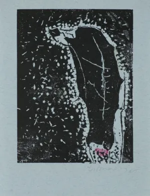linoryt, tusz różowy, papier żeberkowy niebieski - 15.9 x 12cm