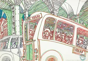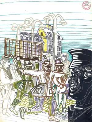 przedruk barwny, kredka, flam. barwne, tusz pióro - 36.9 x 48.5cm